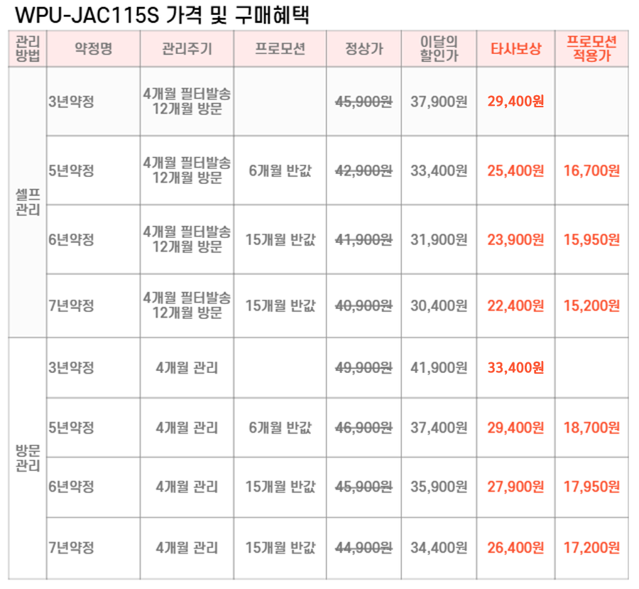 WPU-JAC115S SK매직 [SK매직] 초소형 플러스 직수 정수기 제품분류 정수기 정수방식 직수형 기능 냉온전용 AS기간 렌탈기간내 최저 렌탈가 월 22,400 (렌탈가) 제휴카드 할인가 월 (렌탈가) 3년 5년 6년 7년 셀프관리 방문관리/4개월 셀프관리(타사보상) 방문관리/4개월(타사보상) 제품색상 선택 내츄럴화이트 + 0원 뉴트럴실버 + 0원 할인 제휴카드 보기 렌탈신청 장바구니