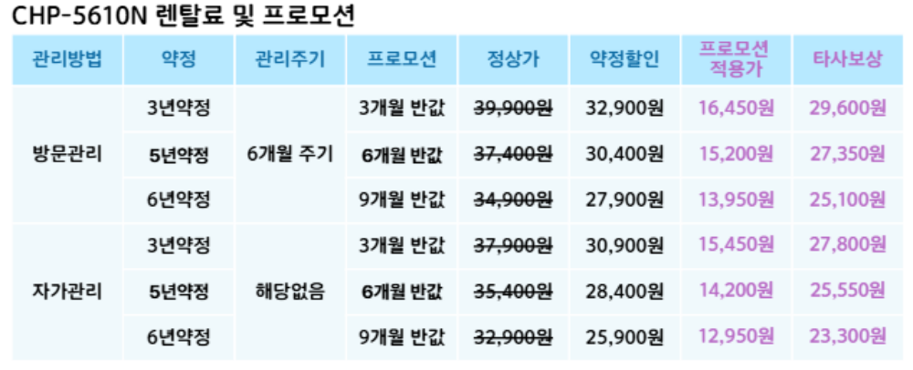 CHP-5610N 코웨이 [코웨이] 아이콘 스탠드 정수기 제품분류 정수기 정수방식 탱크형 기능 냉온전용 AS기간 렌탈기간내 최저 렌탈가 월 23,300 (렌탈가) 제휴카드 할인가 월 (렌탈가) 3년 5년 6년 자가관리(타사보상) 자가관리 방문관리/6개월(타사보상) 방문관리/6개월 제품색상 선택 그레이 + 0원 베이지 + 0원 블루 + 0원 할인 제휴카드 보기 렌탈신청 장바구니